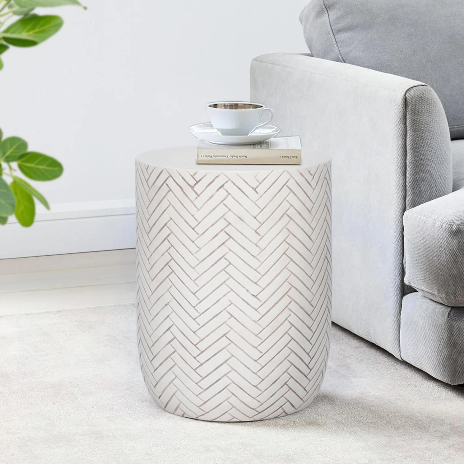 Designed to complement any outdoor space, our table or stool will upgrade your decor in an instant. With a smooth lightweight cement structure, a cylindrical shape and modern design,chevron pattern,this stool offers high durability and stunning looks for your backyard or patio. Perfect as an end table next to your chat set or sectional, this piece will hold any snacks or chilled drinks in sophisticated grace.